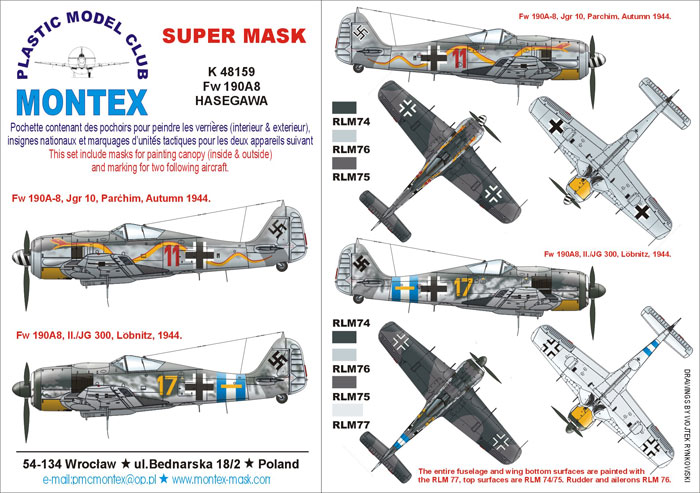 Montex - MXK48285 - 1:48 | Focke-Wulf Fw-190A-8 2 canopy frame paint mask (inside & outside) + insignia and markings masks + decals (designed to be used with Tamiya kits) More | Aircraft paint masks (self adhesive) | Catalogue | £11.50 | ||