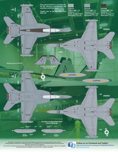 Boeing EA-18G VAQ-130 Zappers. VAQ-130 is the oldest Electronic Attack (EA) squadron in the U.S. Navy. The Zappers are the newest squadron to recently transition from the Prowler to the Growler and this decal sheet captures their new CAG and CO markings for their new aircraft.