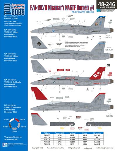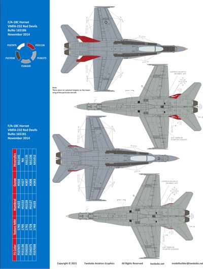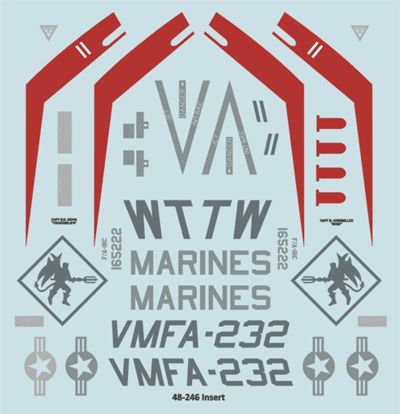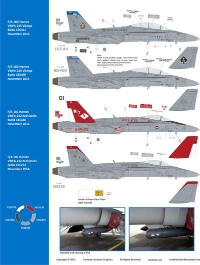 The newest schemes from the VMFA (AW)-225 Vikings and VMFA-232 Red Devils are featured on this sheet. Markings for the CO jet and a line jet from the respective squadrons are included in this product.