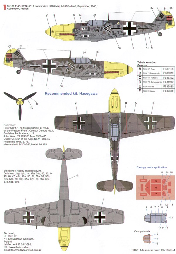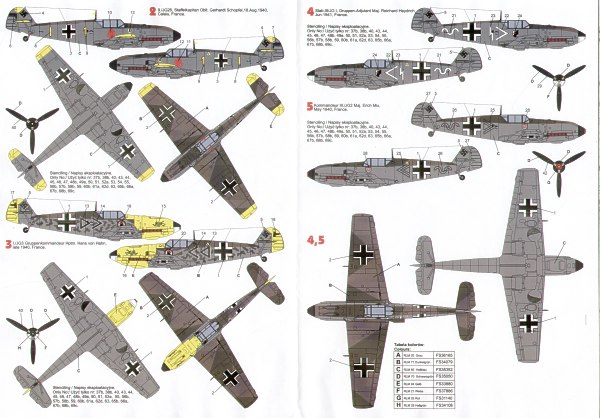 Re-printed! Messerschmitt Bf-109E-4 (5) Black <-+- JG 26 Maj Adolf Galland 9/1940 yellow nose and rudder; Yellow 1 9/JG 26 Oblt Gerhardt Schopfel 8/1940; Black << 1/JG 3 Hptm Hans von Hahn 1940; White <+~ Stab III/JG 1 Maj Reinhard Heydrich 6/1940; Kommandeur III/JG 2 Maj Erich Mix 5/1940. All France. Inc canopy mask