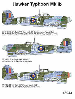 Hawker Typhoon Mk.Ib (3) JP496 HH-W 175 Sqn S/L T.P.Davidson 1943; DN473 OV-E 179 Sqn; DN406 PR-F 609 Sqn Manston 1943