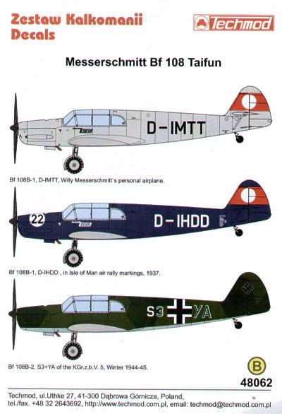 Messerschmitt Bf-108B Taifun Part 1. (3) D-IMTT Willy Messerschmitt's personal aircraft overall RLM 63 light grey; D-IHDD/22 Isle of Man Rally 1937 overall RLM 24 blau; S3+YA KGr.z.b.V.5 Luftwaffe 1944-45 RLM 70/71/65