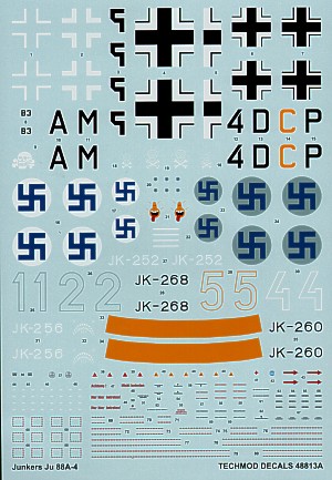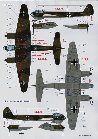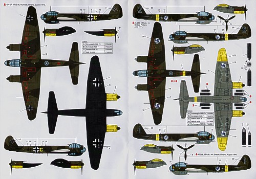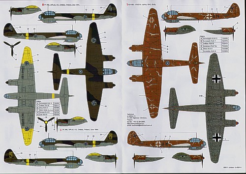 Re-printed! Junkers Ju-88A-4 (5) B3-AM 4/KG 54 Sicily 1943 Desert scheme; 4D+CP 8/KG 30 in Finland 1942 RLM 70/71/22; Finnish Air Force JK-252/2; JK-256/1 both 1/PLeLv 44 1944 RLM 70/71/65; JK-260/4 2/PLeLv 44. Inc Stencil Data