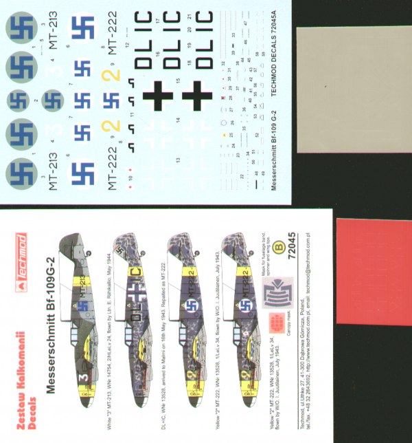 Messerschmitt Bf-109G-2 Finnish Air Force (4) MT-213 White 3 blue swastika national insignia on grey disc; MT-222 3 versions. Luftwaffe delivery scheme DL+IC; Yellow 2 with or without Ace of Diamonds badge