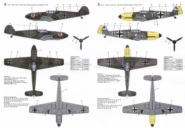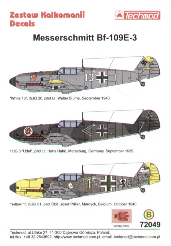 Messerschmitt Bf-109E-3 (3) White 17 3/JG 26 Lt Walter Blume 9/1940; Black < 1/JG 3 Udet Lt Hans Hahn, 9/1939; Yellow 1 6/JG 51 Oblt Josef Priller 10/1940. Inc canopy mask