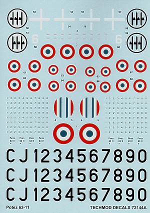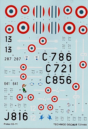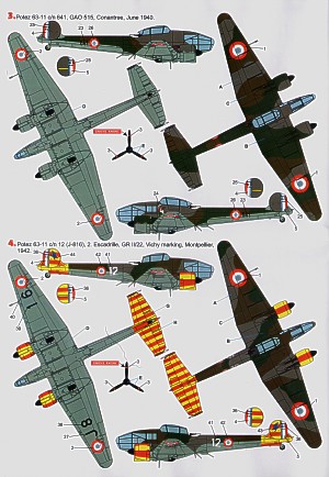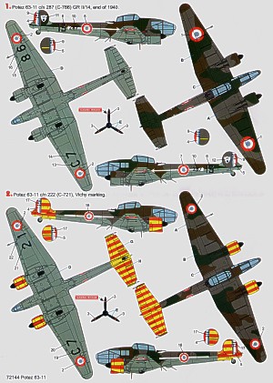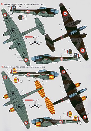 Potez 63-11 (7) French Air Force 287/13 GR 11/14; 641 GAO 515; C856/4 2 Escadrille all 1940; C721; 6 GR1/36; J816/12 2 Escadrille all Vichy markings with red/yellow stripes in tail and engines 1942; White 6 Regia Aeronautica 1943. Inc canopy mask