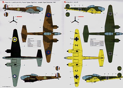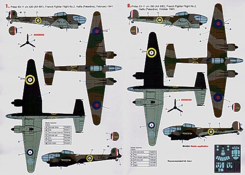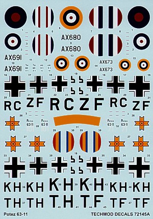Potez 63-11 (8) AX691, AX680 and AX673 all French Fighter Flight in RAF markings, Palestine/Egypt 1941; No 71 or No 101 Rumanian Air Force 1942; Luftwaffe RC+2F; KH+TH; KH+TF Aviation Research Institute 1944. Inc canopy mask