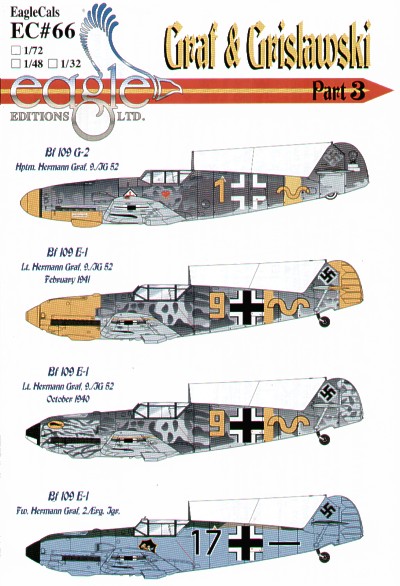 Eagle Cal - EAG32067 - 1:32 | Messerschmitt Bf-109G Graf and Grislawski 9/JG 52 Part 4 (4) Grislawski Bf-109G-2 Yellow 10+~; Bf-109G-4 White 9 (ex NI+GU) both Russia 1942/43; Graf Bf-109G-6 <<+- Stab/JG 52 Poland 1944. All in variations of RLM 74/75/76. G-5 <<+- Stab/JG 11 overall RLM 76 hi-altitude scheme. All have yellow RLM 04 lower nose and tail band More | Aircraft decals (military) | Catalogue | £17.50 | ||