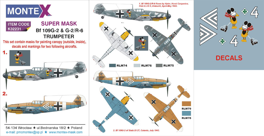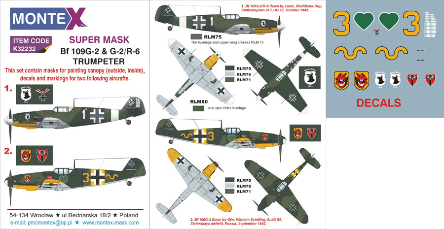 Montex - MXK32232 - 1:32 | Messerschmitt Bf-109G-2 & G-2/R-6 (canopy frame paint masks (inside and outside)) insignia and markings masks + decals (designed to be used with Trumpeter kits) More | Aircraft paint masks (self adhesive) | Catalogue | £11.50 | ||