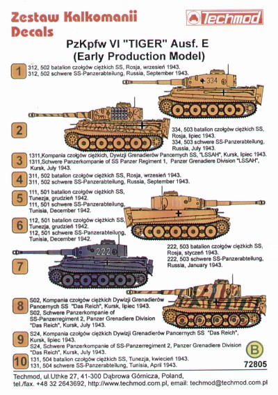 Techmod - TM72805 - 1:72 | Pz.Kpfw.VI Tiger Ausf.E Early Production. Markings for 10 Tiger s in various camouflages in Russia and Tunisia 1943 Camouflage & markings versions "312″, 502 sPzAbt., Russia, September 1943 "334″, 503 sPzAbt., Russia, July 1943 "1311″, sPzKp of SS-PzRgt.1, Panzer Grenadier Division "LSSAH", Kursk, July 1943 "311″, 502 sPzAbt., Russia, September 1943 "111″, 501 sPzAbt., Tunisia, December 1943 "112″, 501 sPzAbt., Tunisia, December 1943 "222″, 503 sPzAbt., Russia, January 1943 "S02″, sPzKp of SS-PzRgt.2, Panzer Grenadier Division "Das Reich", Kursk, July 1943 "S24″, sPzKp of SS-PzRgt.2, Panzer Grenadier Division "Das Reich", Kursk, July 1943 "131″, 504 sPzAbt., Tunisia, April 1943 More | Military vehicle decals | Catalogue | £5.40 | ||
