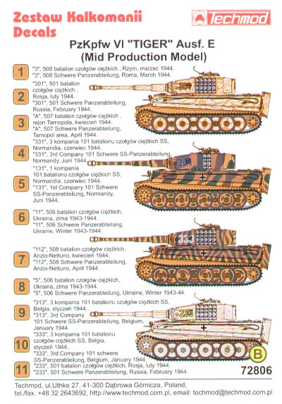 Techmod - TM72806 - 1:72 | Pz.Kpfw.VI Tiger Ausf.E Mid Production Model 11 Different camouflage schemes scheme variations using Dunkelgelb/Braun RAL8000/Olivegrun RAL6003 operating in Italy, Normandy, Ukraine, Russia, Anzio, Belgium Camouflage & markings versions "3″, 508 sPzAbt., Roma, March 1944 "301″, sPzAbt.501; Russia, February 1944 "A", sPzAbt.507; Tarnopol area, April 1944 "331″, 3.Kompanie sSSPzAbt.101, Normandy, June 1944 "131″, 1.Kompanie sSSPzAbt.101; Normandy, June 1944 "11″, sPzAbt.506; Ukraine, Winter 1943-1944 "112″, sPzAbt.508; Anzio-Nettuno, April 1944 "5″, sPzAbt.506; Ukraine, Winter 1943-1944 "313″, 3.Kompanie sSSPzAbt.101; Belgium, January 1944 "333″, 3.Kompanie sSSPzAbt.101; Belgium, January 1944 "233″, sPzAbt.501; Russia, February 1944 More | Military vehicle decals | Catalogue | £5.40 | ||
