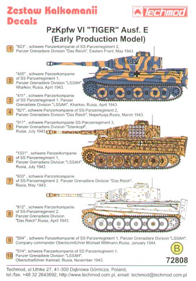 Techmod - TM72808 - 1:72 | Pz.Kpfw.VI Tiger Ausf.E Early Production Model 10 different camouflage schemes scheme variations using Panzer Grey RAL7021/Dunkelgelb/Braun RAL8000/Olivegrun RAL6003 operating in Russia 1943 Camouflage & markings versions "823″, sPzKp of SS-PzRgt.2, Panzer Grenadier Division "Das Reich", Eastern Front, May 1943 "405″, sPzKp of SS-PzRgt.1, Panzer Grenadier Division "LSSAH", Kharkov, Russia, April 1943 "411″, sPzKp of SS-PzRgt.1, Panzer Grenadier Division "LSSAH", Kharkov, Russia, April 1943 "821″, sPzKp of SS-PzRgt.2, Panzer Grenadier Division "Das Reich", Nepartyaja, Russia, March 1943 "911″, sPzKp of SS-PzRgt.3, Panzer Grenadier Division "Totenkopf", Russia, July 1943 "1331″, sPzKp of SS-PzRgt.1, Panzer Grenadier Division "LSSAH", Russia, July 1943 "833″, sPzKp of SS-PzRgt.2, Panzer Grenadier Division "Das Reich", Russia, May 1943 "812″, sPzKp of SS-PzRgt.2, Panzer Grenadier Division "Das Reich", Russia, April 1943 "S04″, sPzKp of SS-PzRgt.1, Panzer Grenadier Division "LSSAH", Obersturmfƒ¼hrer Michael Wittmann, Russia, January 1944 "S14″, sPzKp of SS-PzRgt.1, Panzer Grenadier Division "LSSAH", Oberscharfƒ¼hrer Kamrad, Russia, November 1943 More | Aircraft decals (military) | Catalogue | £5.40 | ||
