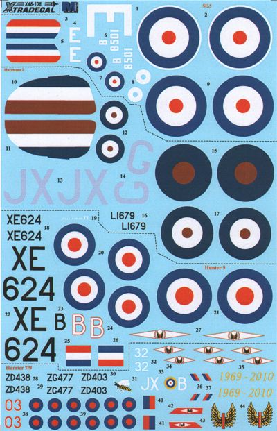 RFC/RAF 100 Years of 1 Squadron (6) Royal_Aircraft_Factory S.E.5A B8501/E France 1918; Hawker Hurricane Mk.I L1679 JX-G Fg.Off Paul Richey France 1940; Hawker Hunter FGA Mk.9 XB624/B Flt/Lt R.A.Pollock flown under Tower Bridge; Harrier GR.7 ZD438/03 RAF Wittering 1994; Harrier GR.9 ZG403/32 RAF Cottesmore with commemorative markings for JX-B flown by Flt.Lt A.V.Clowes, 2010; Harrier GR.9 ZG477/67A in special markings with red/white fin for Harrier Retirement flight 15/12/2010