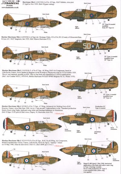 Hawker Hurricane Mk.I Early with fabric wing (12) K5083 Prototype first flown by George Bulman 6/11/35 Brooklands overall silver; L1568/S b Flt 73 Sqn 1938 RAF Digby; L1599/L B Flt 56 Sqn RAF Nth Weald 1938; L1768 GG-K 151 Sqn RAF Nth Weald 1939; L1727 FT-R 43 Sqn RAF Tangmere 1939; L1833 NU-J 85 Sqn RAF Debden 1939; L2039 SD-A S/Ldr Montague Clube CO 501 (County of Gloucester) Sqn Tangmere 1939; L1619 LK-P 87 Sqn 60 Wing Lille/Seclin France 1939; All with 2 blade props. N2358/Z 73 Sqn 67 Wing Advanced Air Striking Force RAF Rouvres, France May/June 1940 red/white/blue rudder stripes; N2319 VY-P 85 Sqn 60 Wing Air Component BEF France flown by Sgt G.Sammy Allard on 10/5/40 when he shot down two He111s, red/white/blue fin flash; Finnish Air Force HC-456 1/Lrntolaivue 30 June 1941; HC-451 Lrntolaivue 10 1941
