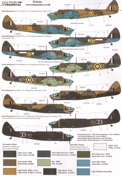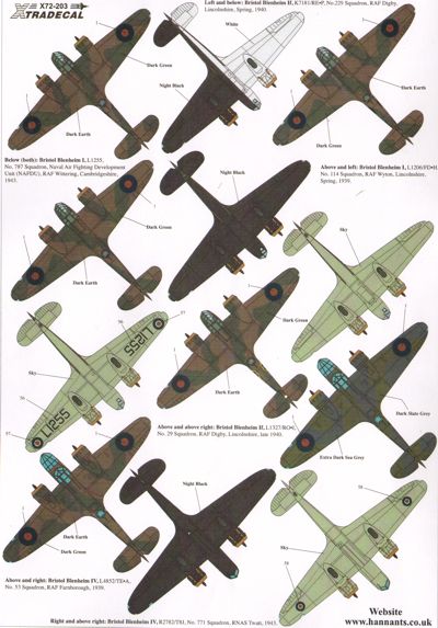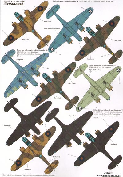 Bristol Blenheim Mk.I/Mk.IF/Mk.IV Pt.2 (11) Mk.I L1200 FD-H 114 Sqn RAF Wyton; L1255 787 Sqn Naval Air Fighting Development Unit (NAFDU) RAF Wittering 1943; Mk.If K7181 RE-P 229 Sqn RAF Digby 1940; L1327 RO-I 29 Sqn RAF Digby 1940; Mk.IV L4852 TE-A 53 Sqn RAF Farnborough 1939; R2782 TBJ 771 Sqn RNAS Twatt 1943; T2177 AD-V 113 Sqn Greece 1941; Z5893/W 11/14 Combined Sqn Habbaniya, Iraq 1941; X5955 WR-B 248 Sqn RAF Dyce 1941; Z9585/? 89 Sqn Shark Mouth N.Africa; Z9652/33 No.1 Middle East Check & Conversion Unit, Bilbels 1943.