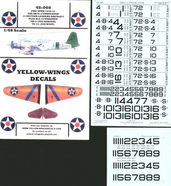 Vought SB2U-1 Vindicators USN 12 Section Leaders aircraft and all wingmen from VB-4 USS Ranger and VB-72 USS Wasp Manufacturer: Yellow Wings Code Number: YW48008 Scale: 1:48 Item type: Aircraft decals (military) Price: