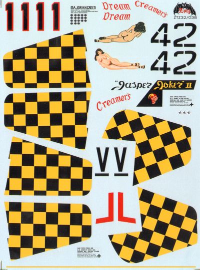 North-American P-51D Mustangs (3) 44-13498/11 Maj H.Green CO 317th FS/325th FG Italy, black/yellow check tail, red nose; 44-14803 E9-V Lt Donald Vulgamore 376th FS/361st FG 'Jasper Joker II' yellow nose and rudder; No 42 Lt C.White 301st FS/332nd FG 'Creaners Dream' Italy , red nose and tail, Tuskegee Sqn.